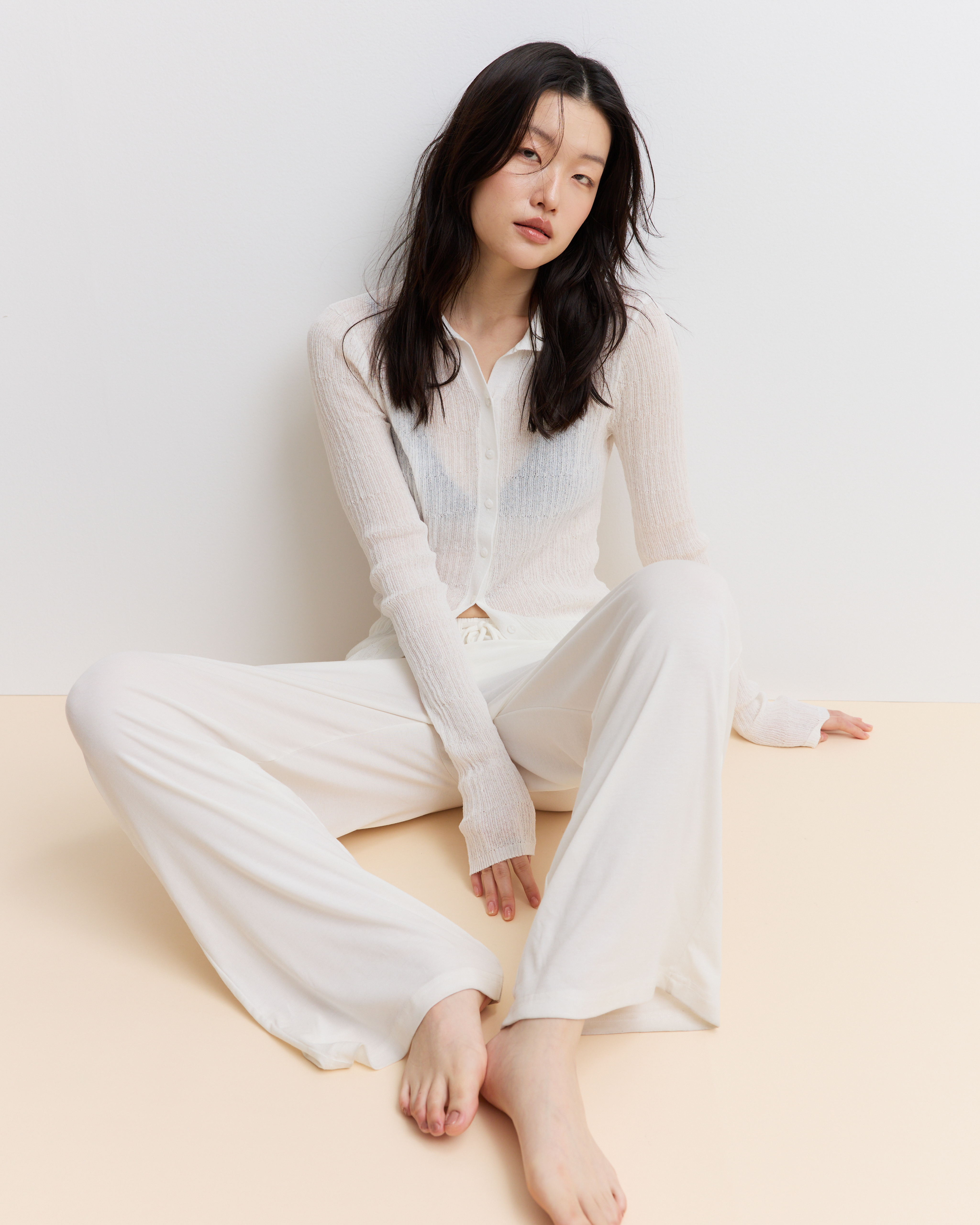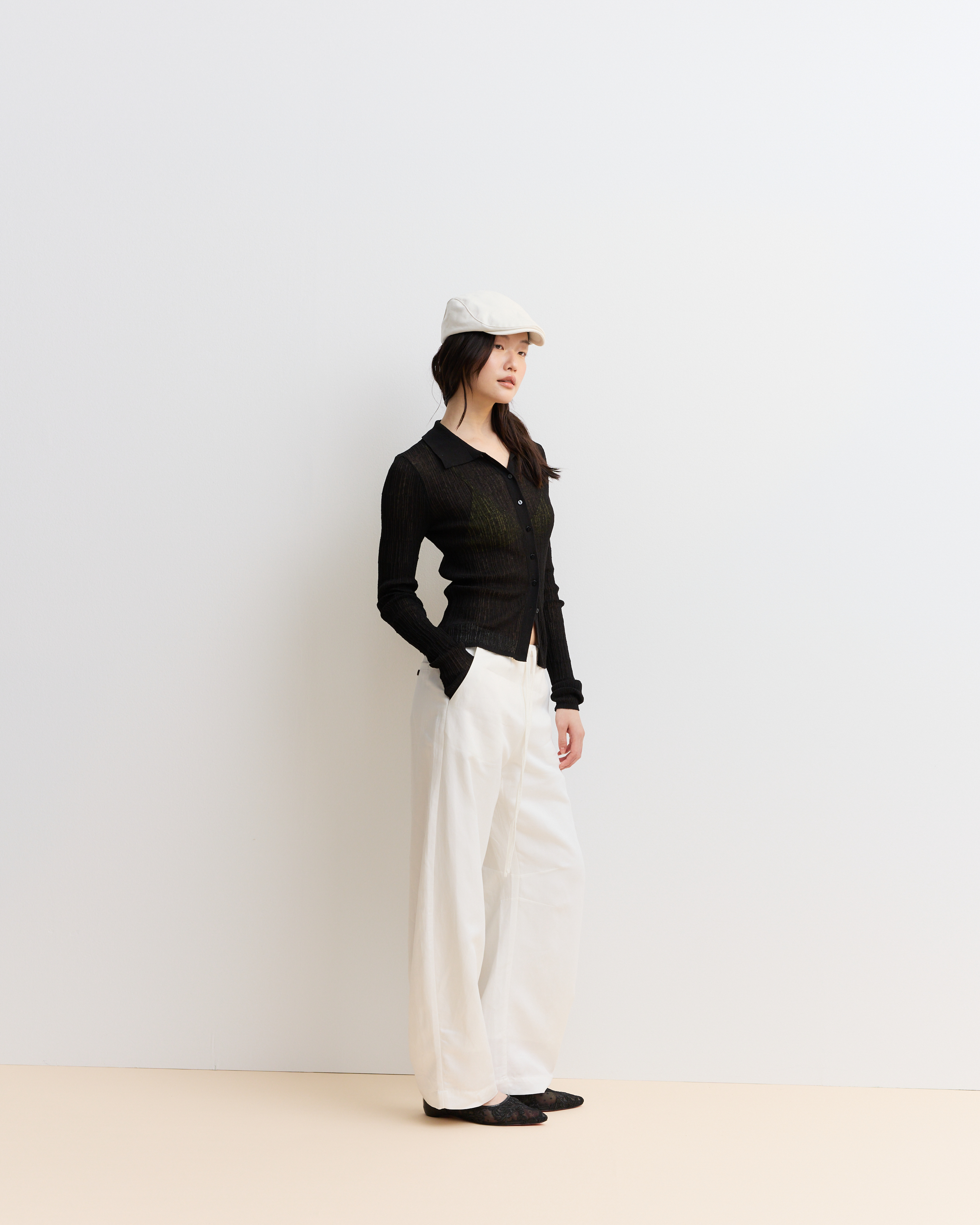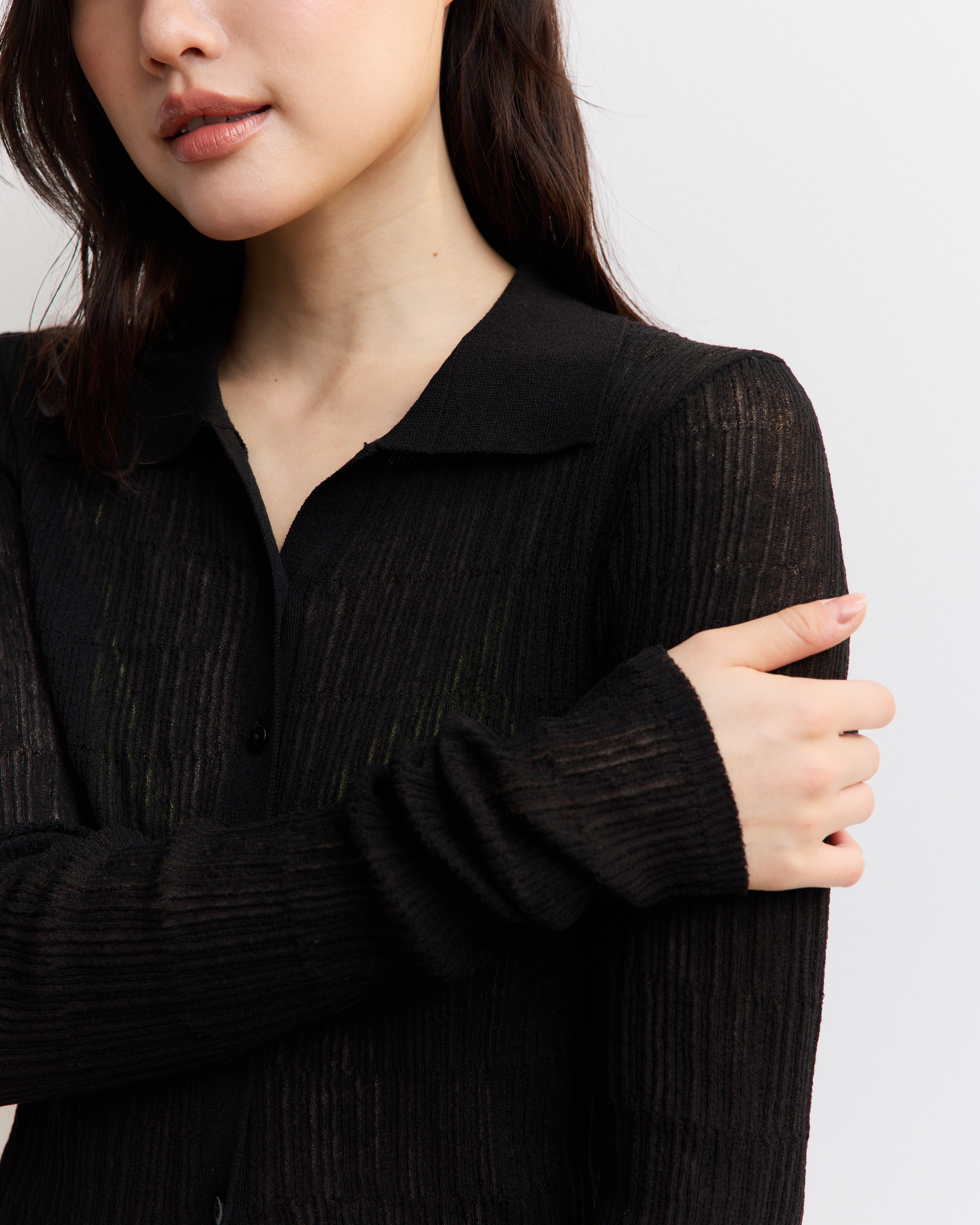 輕透細針織POLO上衣,若隱若現的微透層次,帶出柔和細膩的布面質感。修身版型順著身體線條自然延伸,貼合卻不緊繃。經典 POLO 領與排釦設計,整體在優雅與日常之間取得平衡