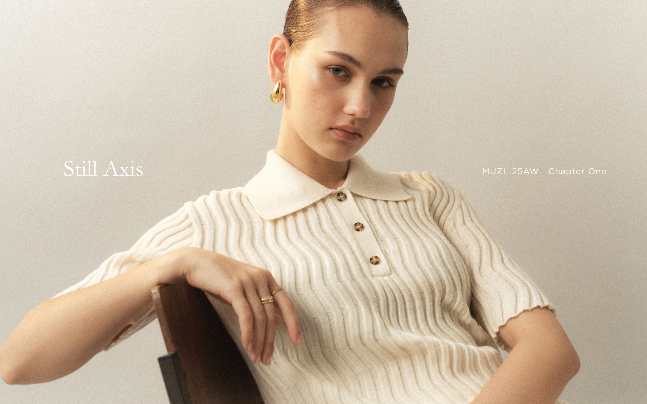 Still Axis|MUZI 2025 秋冬系列在快速運轉的世界裡,女人如何保持內心的靜謐?MUZI 2025 秋冬系列以 Still Axis 為名,回應這個問題。Still 代表內心的柔軟與安定,Axis 則是支撐的軸心與力量。即使城市喧囂不止,她依然能以軸心為基,沉著安然。這一季,我們將大自然的靜謐力量與都市的理性結構交織,描繪出女性「外剛內柔」的姿態,讓穿著成為一種平衡內在與外在的軸心。秋冬,是萬物收斂與沉澱的季節,靈感來自地層的紋理與沙礫的堆積。深栗色如乾裂泥層般沉穩,焦糖色流動著午後陽光的餘溫,岩灰與濃褐交疊出時間的斑駁紋理,而裸米與砂杏則映照如沙丘邊界的柔光。這不只是色彩的選擇,更是一種安靜卻堅韌的力量。透過羊毛、羊絨與皮革的質感,服裝呈現外在的堅實與內裡的柔軟;在剪裁與結構上,俐落的線條和立體的層次呼應都市節奏,讓穿著者能自由穿梭於通勤、旅行與日常,於靜謐與喧囂之間找到平衡。Still Axis 不僅是系列的名稱,更是一種生活態度。它象徵著在快速變動的時代裡,女性以靜謐的軸心支撐自己,在層層經歷與底蘊的堆疊中養成力量。MUZI 希望這一季的服裝,成為女性日常的安定與依靠,讓她們在每一次呼吸間,都能感受到大地的低語與都市的共鳴。這是一種從容不迫的姿態,一種柔韌而堅定的力量,也是 2025 秋冬系列所欲傳遞的核心精神。