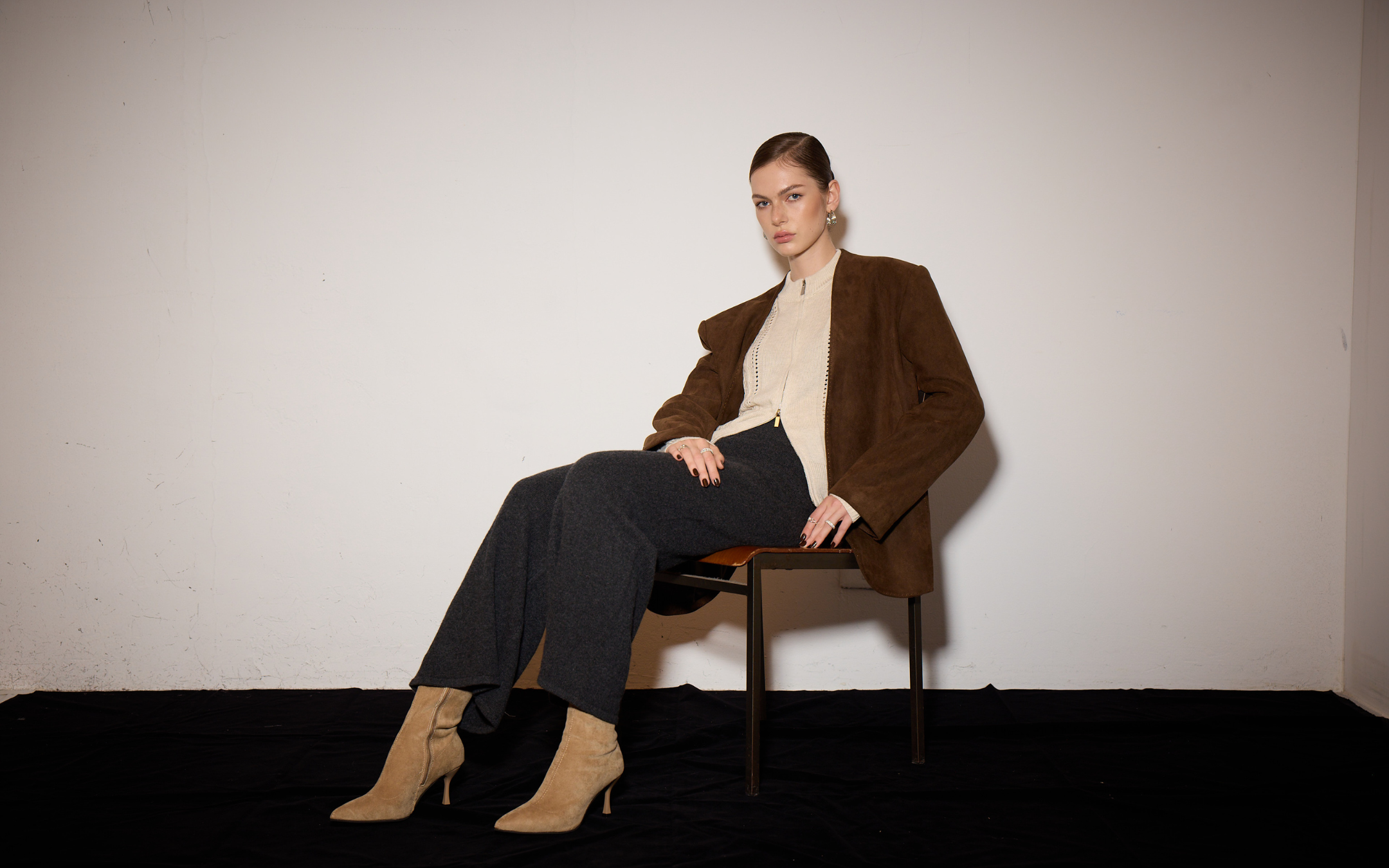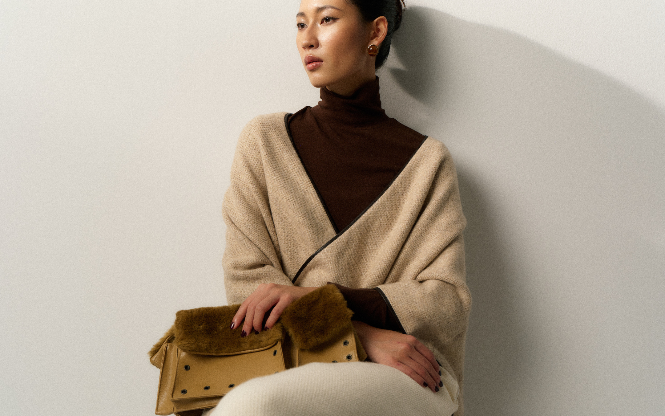 Rooted 來自 root(根),意思是「扎根的、穩固的、深植的」。 Balance 是「平衡」。Rooted Balance = 扎根於內心的平衡 / 內在穩定的力量。 十一月,時間走在季節的縫隙裡。秋的溫潤尚未遠去,冬的冷冽卻已悄然降臨。 白晝漸短,夜色蔓延,陽光變得柔和而短暫,世界的步伐放慢,顯得更加沉穩而有力。 這是一個屬於女性的時刻——靜謐,卻不失力量;柔和,卻堅定。本季以「柔中帶剛」為靈感核心,這份靜默的氛圍,成為設計的出發點。 在過渡與停頓之間,我們探索柔與剛的平衡。柔軟的垂墜線條,承載情緒上的慰藉。 皮革的冷冽光澤,代表堅毅與輪廓;羊毛針織則像擁抱般的溫度,平和卻自帶力量。 材質交錯之間,形成一場低語般的對話。色彩以深棕、墨黑與霧灰為基底,如暮色的沉靜,傳遞穩定與力量; 以燕麥白、米駝、柔米鋪陳過渡的柔光,安撫季節交替的不安; 最後以琥珀黃與夜幕藍作為內斂點綴,如雪地裡的燈火,低調卻無法忽視。 這個系列,不僅是外在的穿著,更是一種生活態度。 它提供安定感,讓人即使在變動中也能優雅自持; 它傳遞不言而喻的低調奢華,延續 Old Money 的精神;它在季節轉折裡,成為旅途與日常的避風港。「靜謐的優雅,柔中帶剛」 —— 在深秋步入初冬的十一月,空氣開始沁涼, 這些服裝成為女性最貼心的陪伴:既能抵禦寒意,又能保持俐落與優雅。 無論是在落葉鋪滿的街道、微光閃爍的午後咖啡館, 還是在初冬夜晚的聚會之中,都能展現從容而堅定的自我。