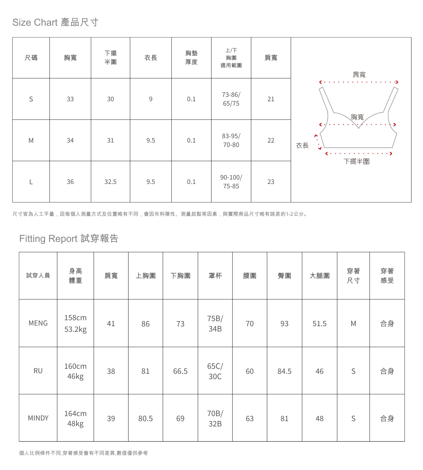 *下胸圍請以實際量測為準;量測方式請參考尺寸圖。