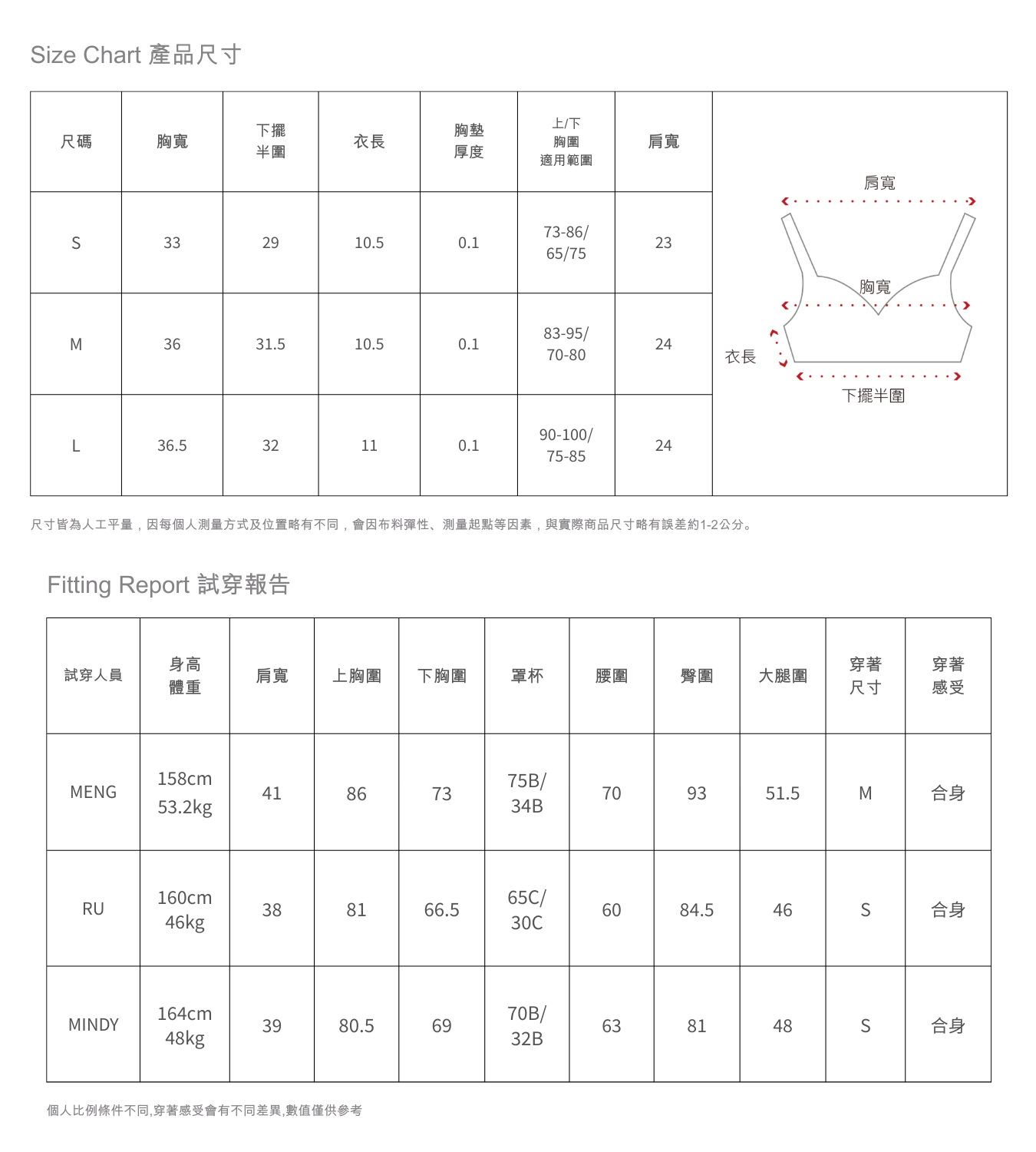 *下胸圍請以實際量測為準;量測方式請參考尺寸圖。