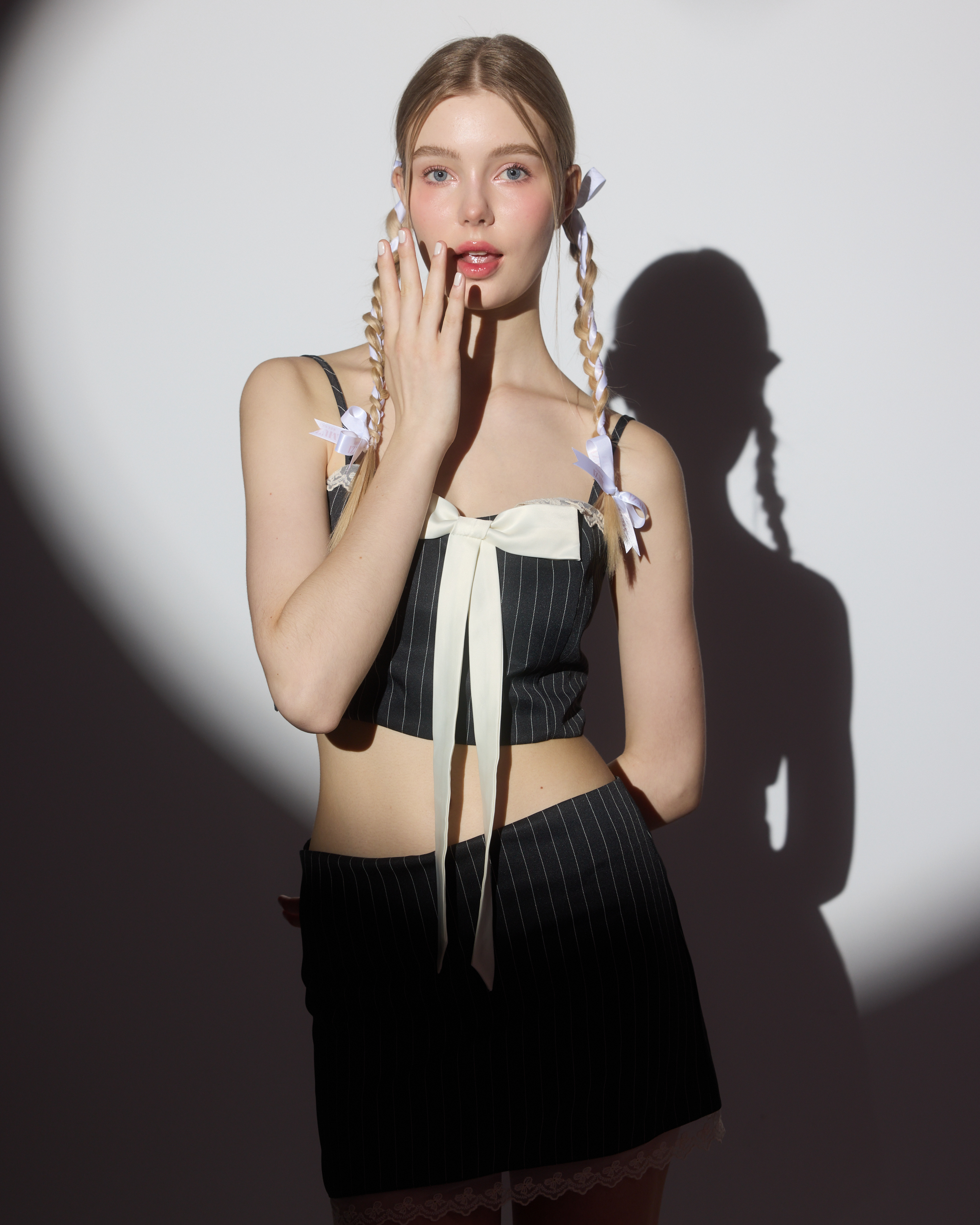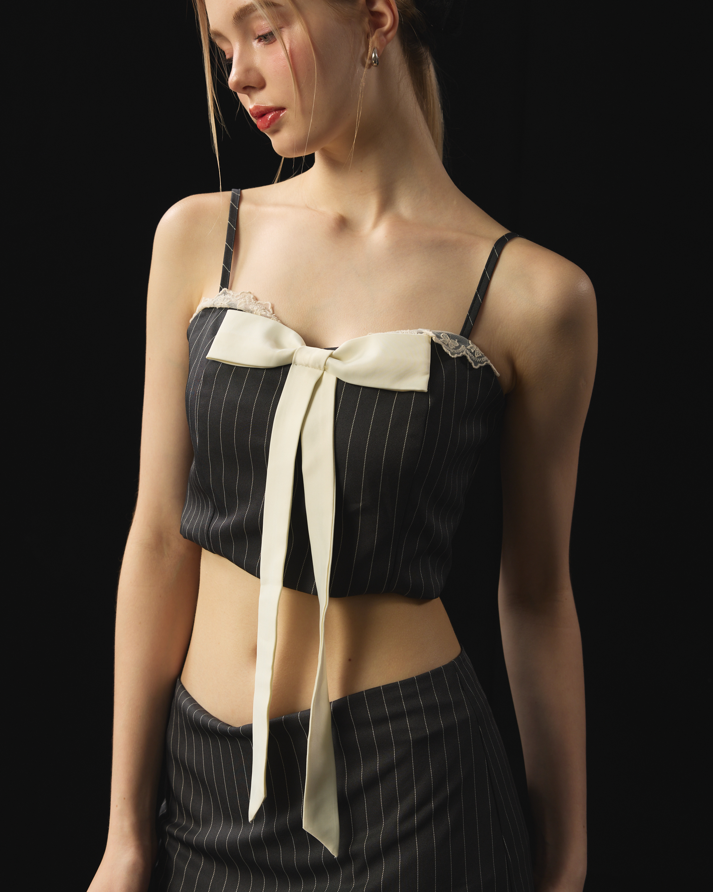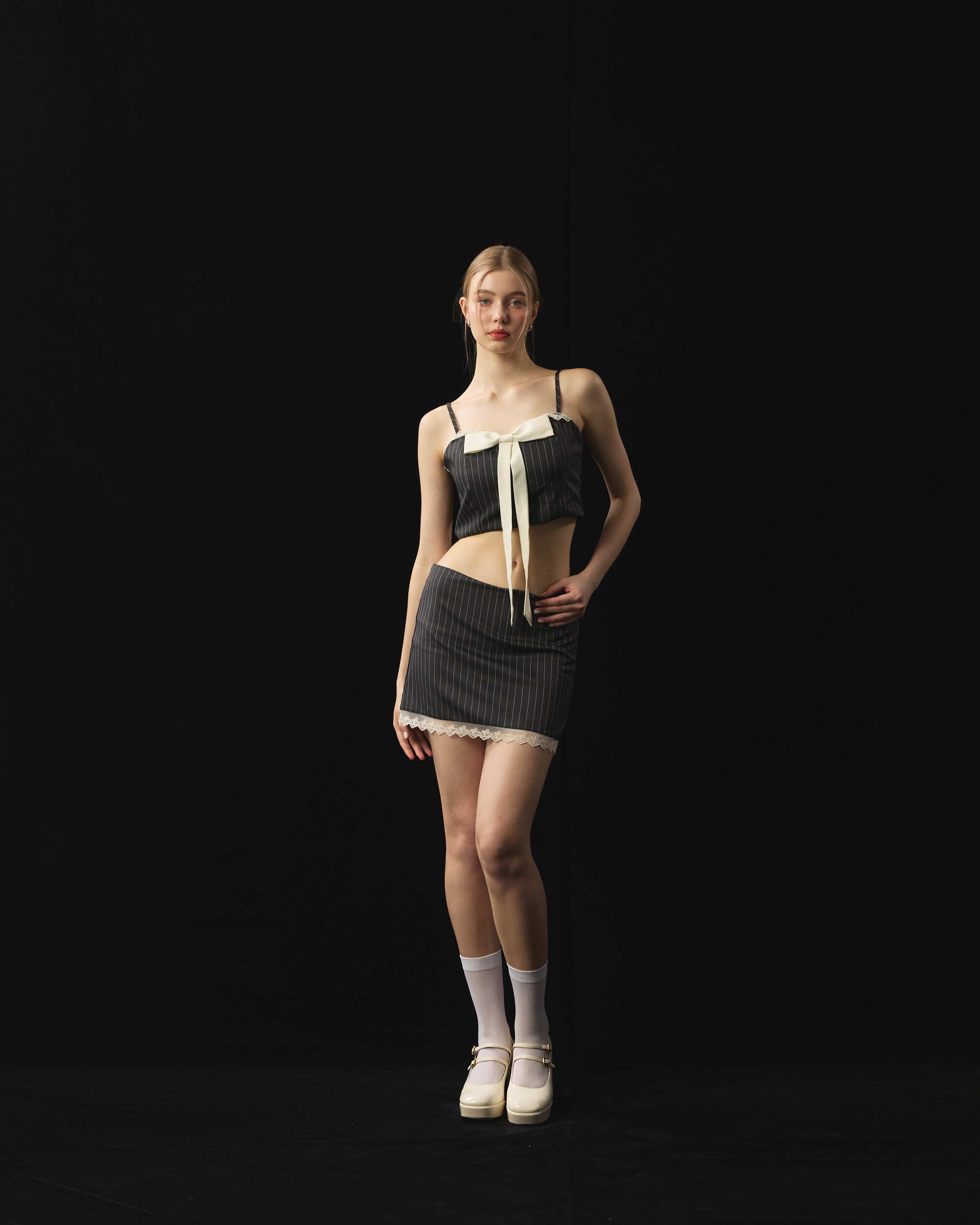 肩部細繩可調節長度側拉鍊設計 方便自行穿脫背心胸上圍有蕾絲+緞面蝴蝶結設計整件布料為直條紋西裝布(此為套裝可拆買)